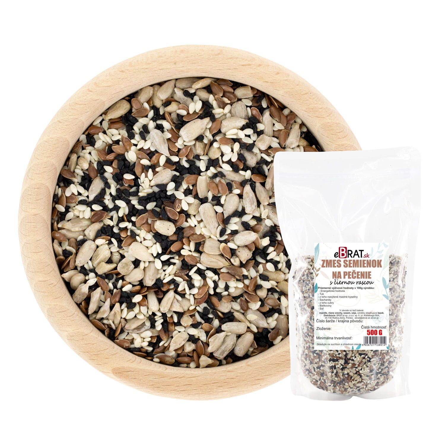 Táto zmes je skutočným pokladom zdravia! Lúpané slnečnicové semená sú zdrojom vitamínu E a zdravých nenasýtených tukov, ktoré podporujú zdravie srdca a pokožky. Ľanové semená majú pozitívny vplyv na trávenie vďaka obsahu vlákniny a omega-3 mastných kyselín. Sezamové semená dodávajú telu vápnik a železo, čím posilňujú kosti a zvyšujú energiu. Čierna rasca, známa aj ako „faraónske zlato“, podporuje imunitný systém, pôsobí protizápalovo a antibakteriálne a zároveň dodáva zmesi výnimočnú chuť. Vďaka tejto zmesi je pečivo nielen chutné, ale aj zdravé.